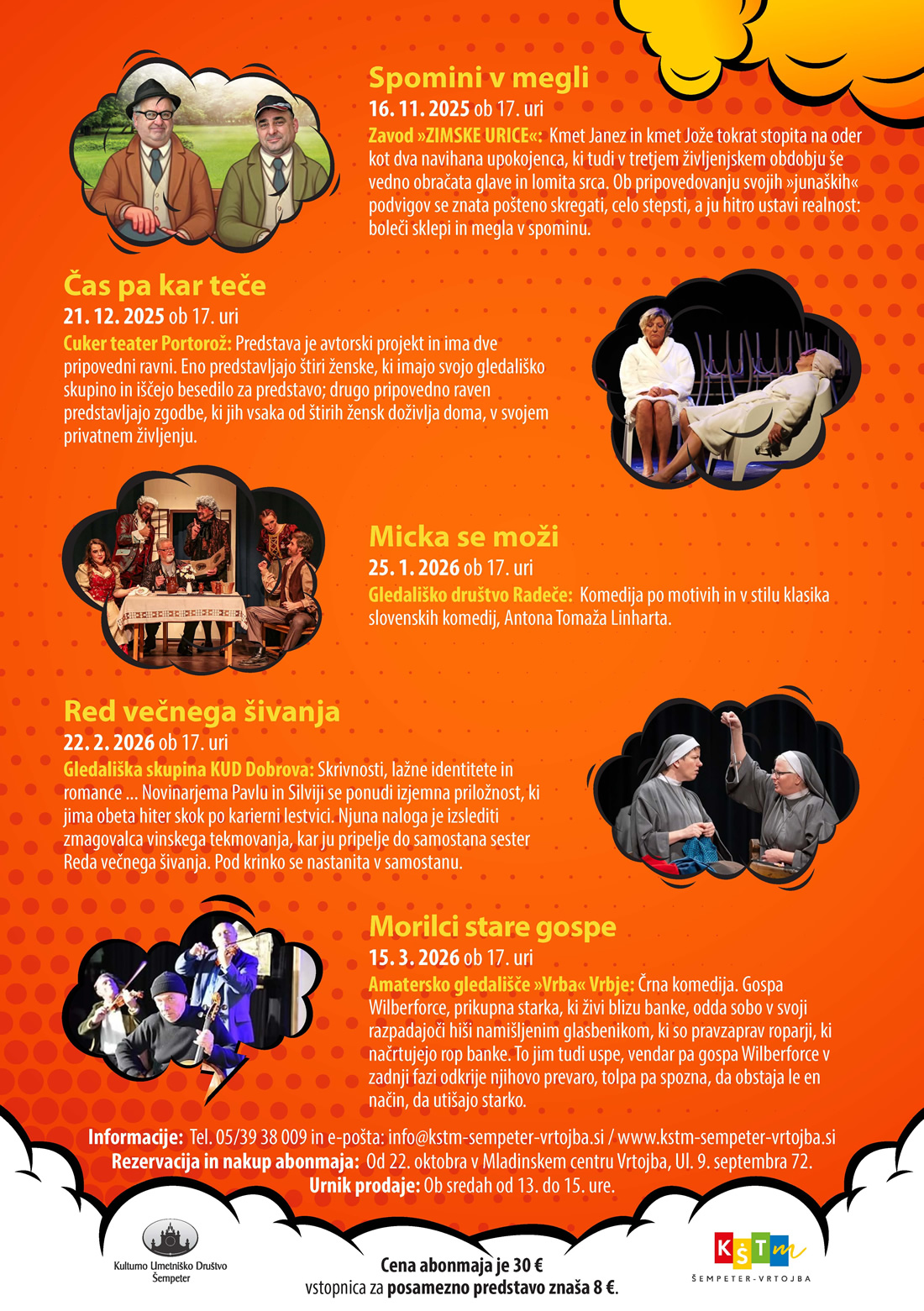 Rezervacija in nakup abonmaja: Od 22. oktobra v Mladinskem centru Vrtojba, Ul. 9. septembra 72.